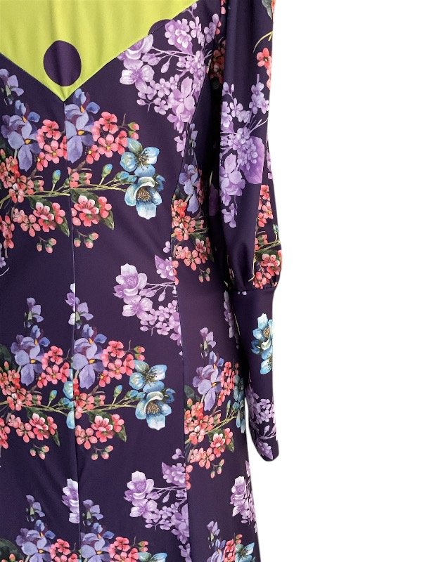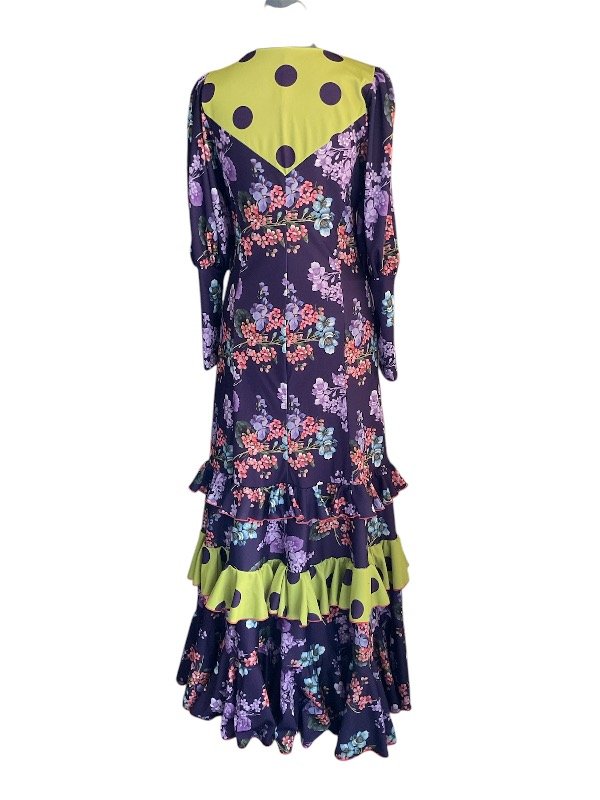 Vestido con recorte en V adelante y atrás falda acampanada con 3 volantes ,cuerpo forrado .